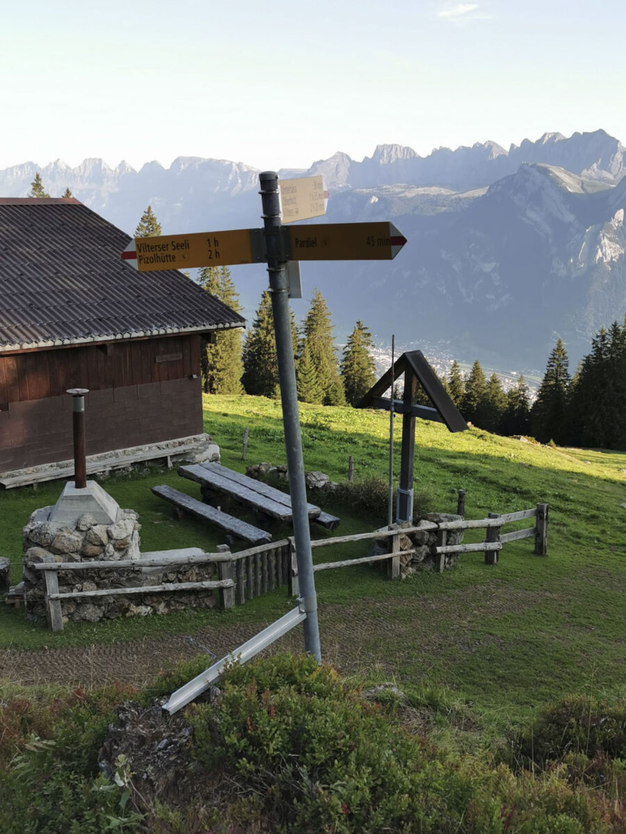 Der See lädt zum Abkühlen ein, bevor es auf dem Höhenweg bis zum Laufbodenstübli geht. Hier ist mit 2‘223 m ü. M. der höchste Punkt unserer Tour erreicht und es geht über einen langezogenen Forstweg stetig abwärts bis oberhalb von Pardiel. Sobald wir die ersten Infotafeln in Edelweissform sehen, folgen wir diesen bergwärts, bis wir am Suntigweidsee ankommen. Hier können wir uns in den Strandkörben erholen und das tolle Panorama geniessen. Zum Schluss geht es mit einem kurzen Abstieg via Obersäss wieder zurück nach Pardiel. Mit der Gondelbahn gelangen wir nach Bad Ragaz.