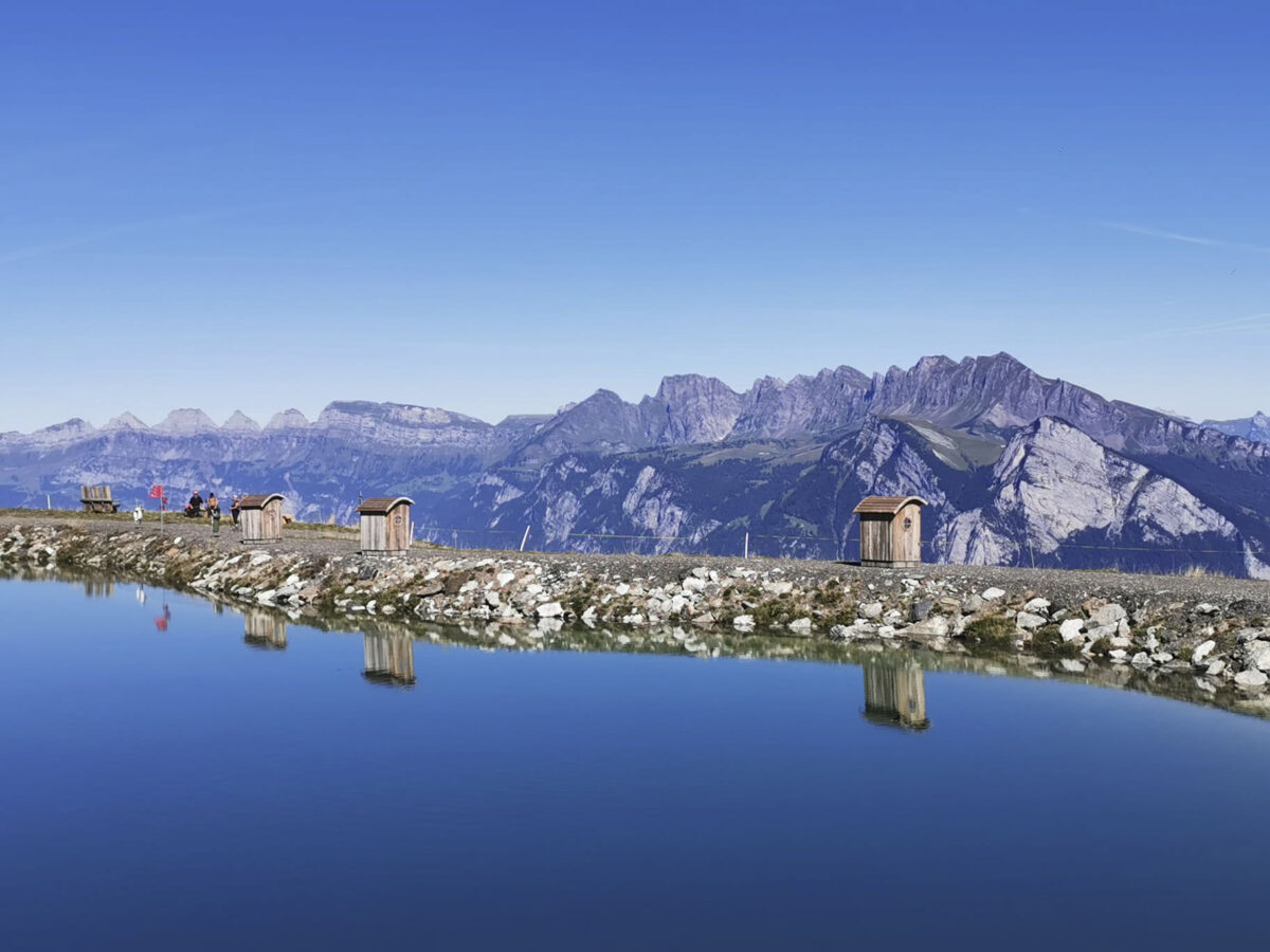 Hier laden die Strandkörbe zum verweilen ein oder wir laufen am See vorbei und dann auf dem Wanderweg bis zur nächsten Weggabelung (Holzwegweiser). Hier nehmen wir den Trail rechts Richtung Tal und dann Richtung Aussichtspunkt Schwarzbüel. Der Ausblick Richtung Churfirsten, Rheintal und Bündner Herrschaft ist überwältigend. Nun laufen wir auf dem Trail zurück Richtung Pardiel. Unterwegs werden wir sicherlich der einen oder anderen Geiss begegnen. In Pardiel nehmen wir die Gondelbahn zurück ins Tal.